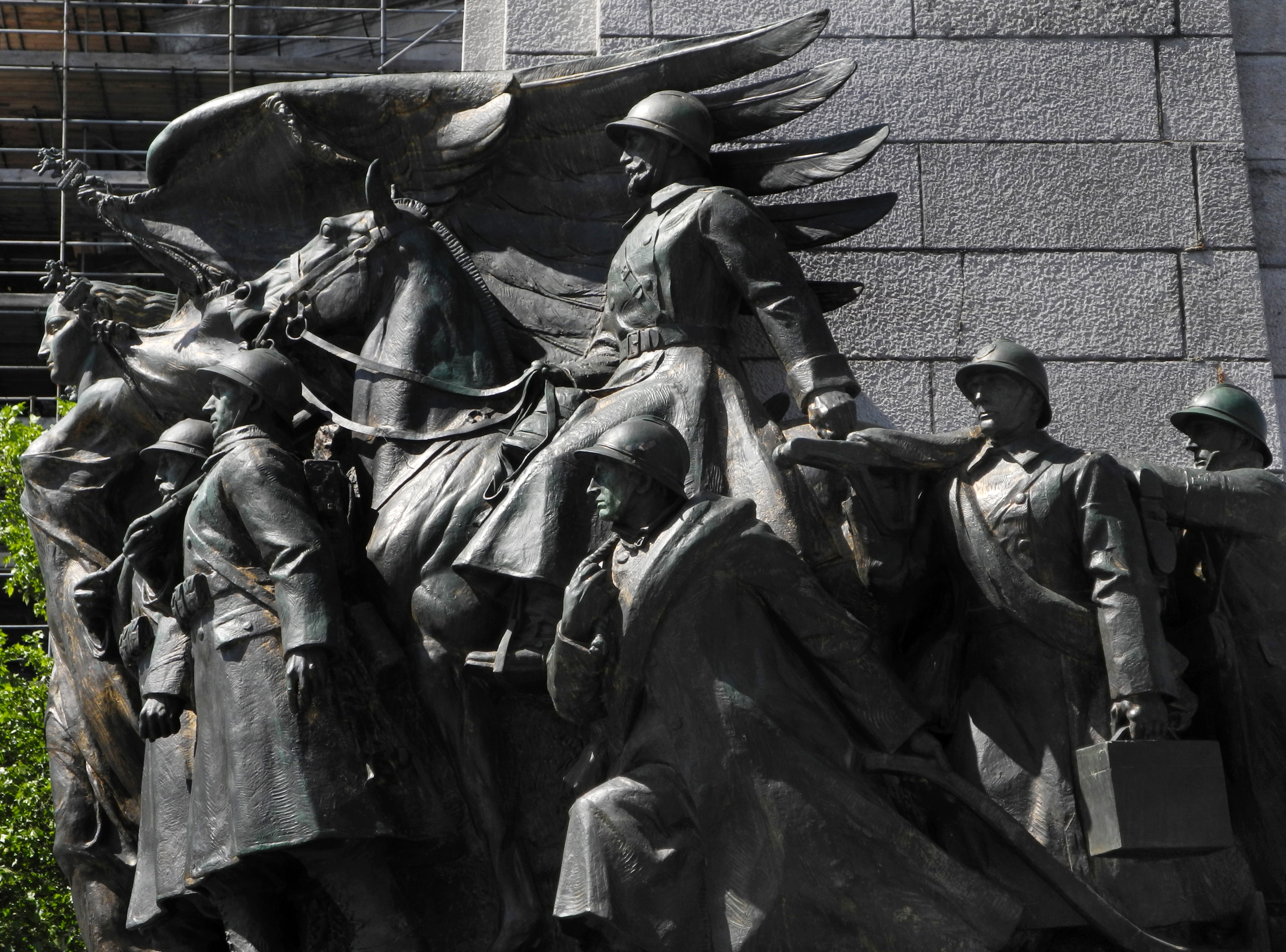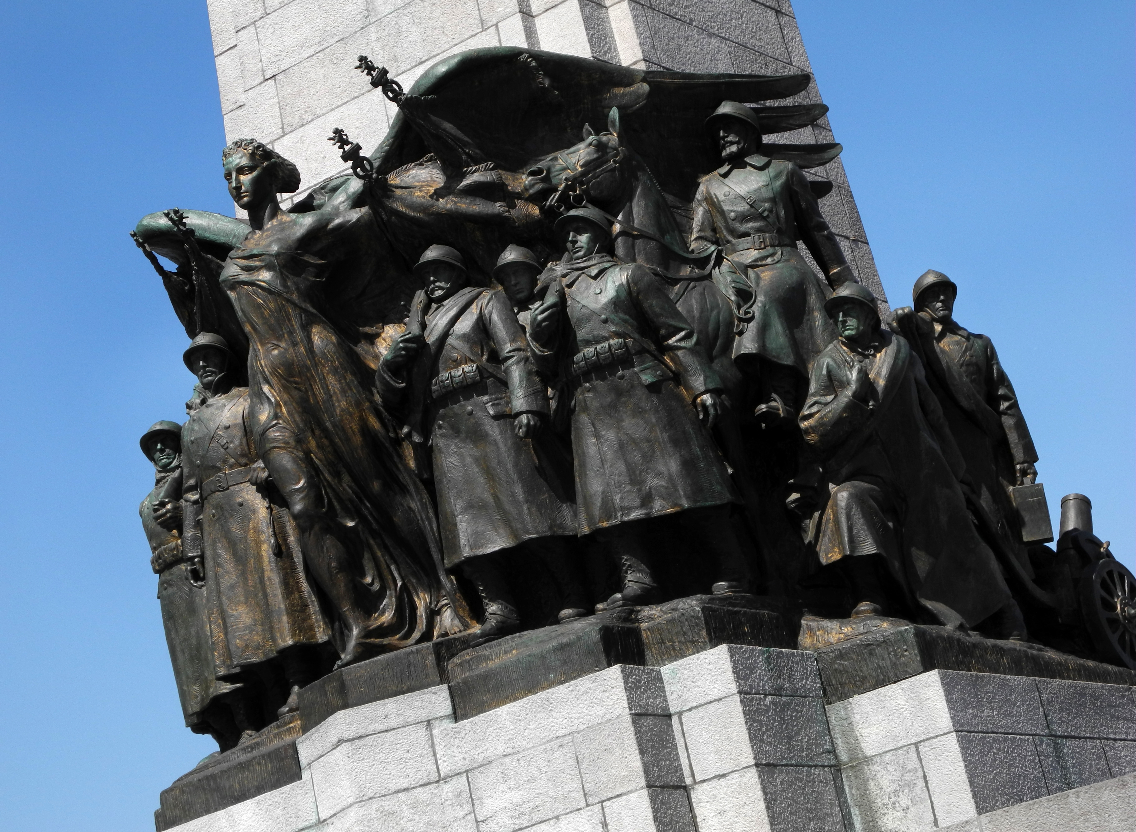 À la base de l’obélisque, un groupe de militaires à pied, officiers et soldats accompagnés de chiens de trait, d'artilleurs et de cavaliers, marche avec détermination sous les ailes protectrices de la Victoire.