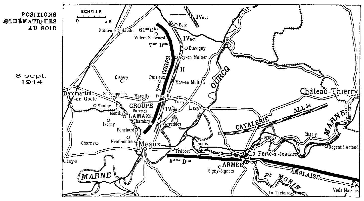 La 8e division, du 4e corps, à la demande de French, qui craint pour sa liaison avec la 6e armée, est engagée contre les Allemands qui occupent les bois de Meaux, au Sud de la Marne.
